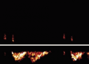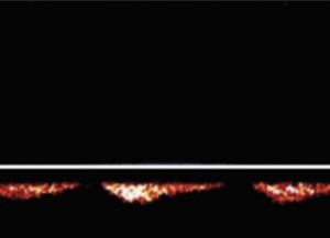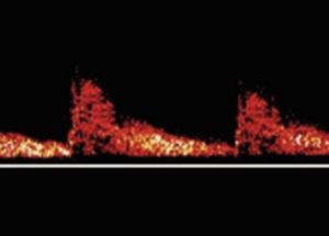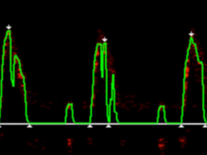 A venous signal will sound slower and ‘whooshy’. The flow profile is likely to be below the line as it represents flow in the opposite direction (i.e. flow travelling towards the probe rather than away from it, as in the descending aorta).